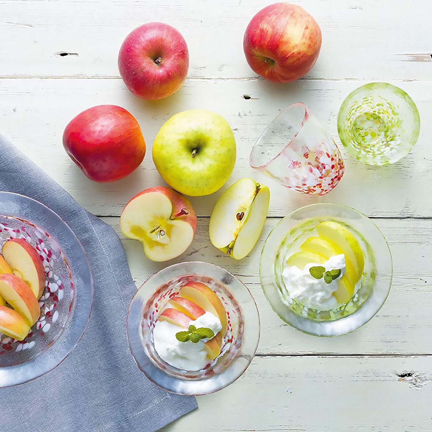 - The glassware describes apples in Aomori Prefecture with fresh colors.
