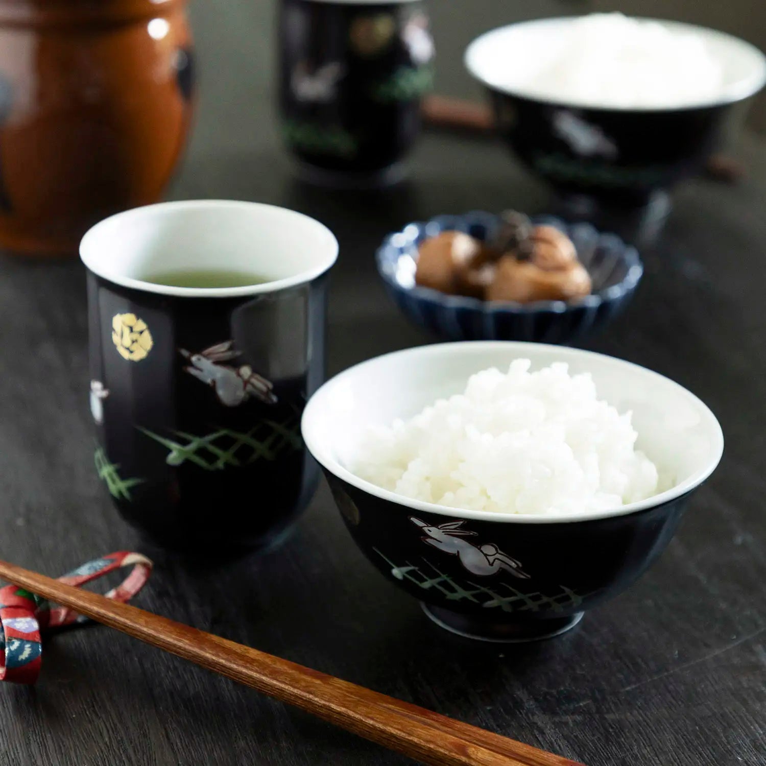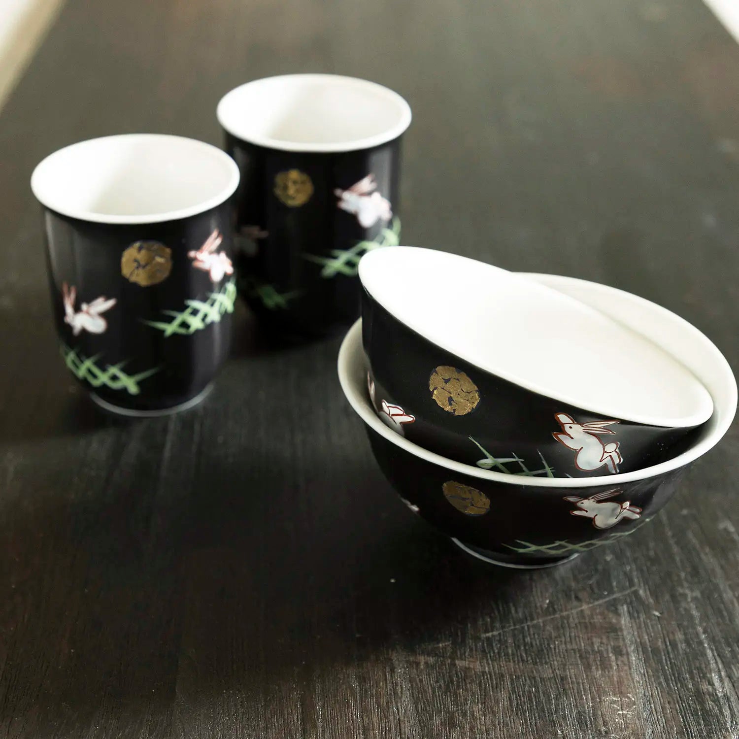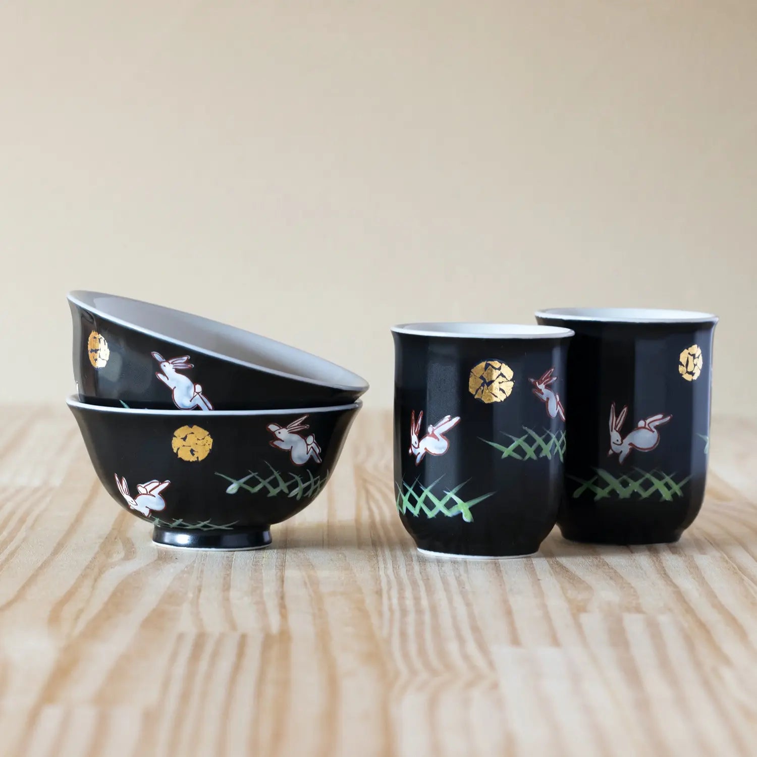 - The set includes 2 rice bowls (large, small) and 2 Yunomi Teacups (large, small).