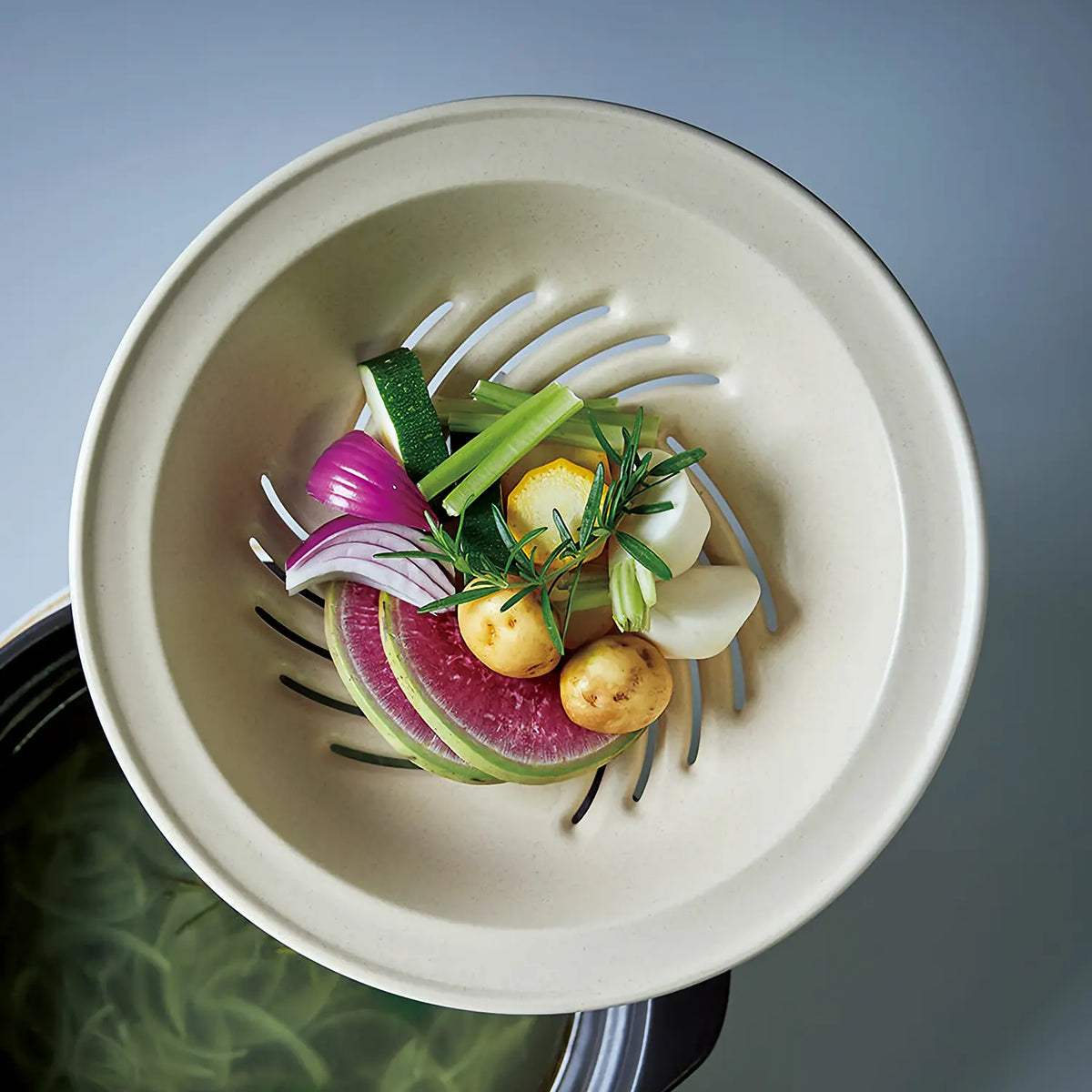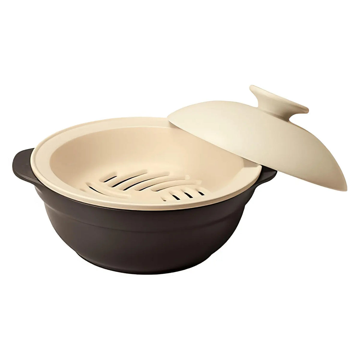 - Set of a donabe casserole and a steamer insert.