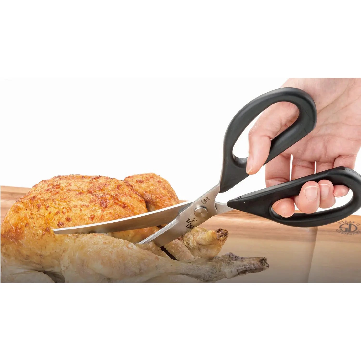 - Curved in shape, this kitchen scissors allows you to cut food with ease. It is easier to cut the fat off the meat with these scissors than with a knife.