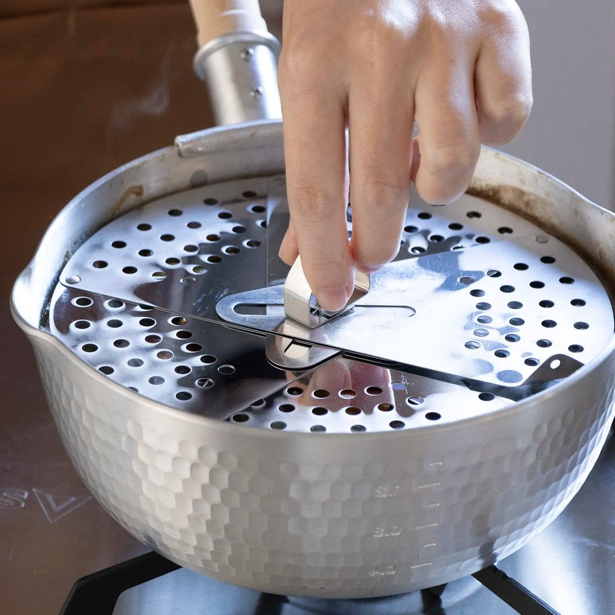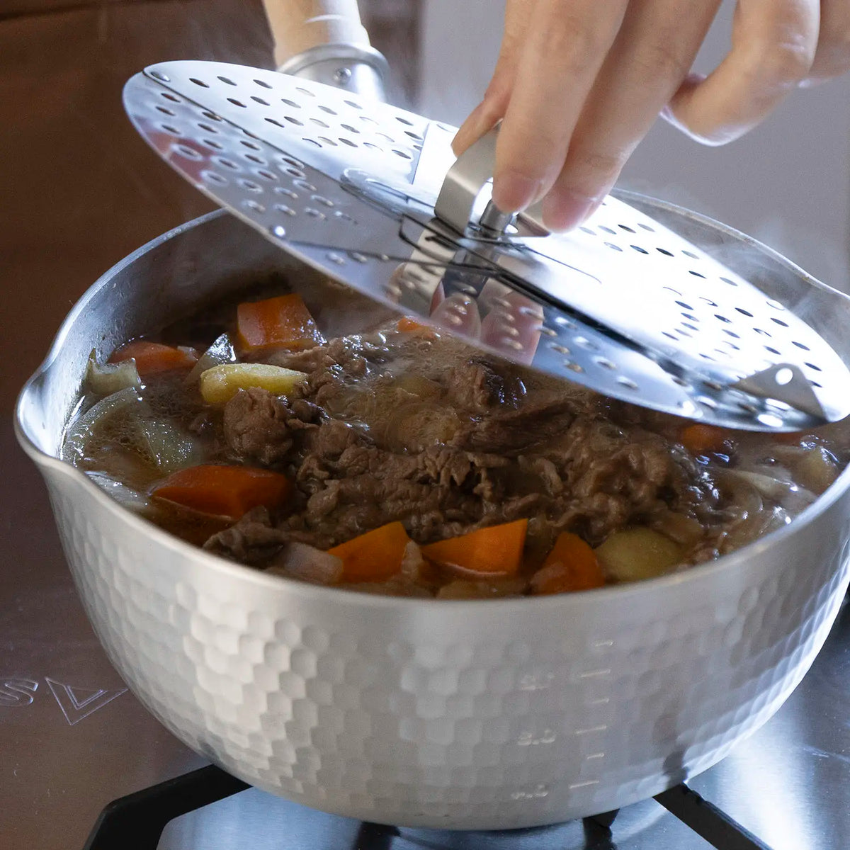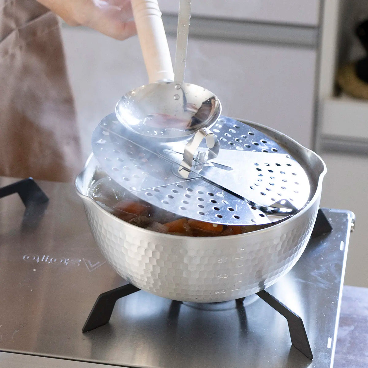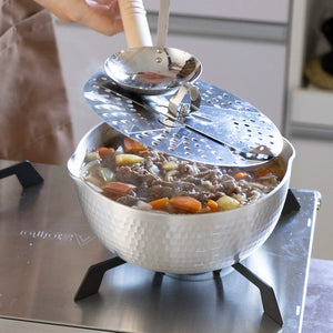- The lid prevents soup boiling over and skims scum floating up to surface.
